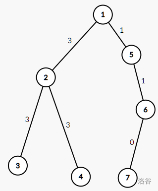 接下来 $n-1$ 行,每行三个正整数 $u_i,v_i,w_i$,表示存在一条道路联通 $u_i$ 和 $v_i$,且该边的运载能力为 $w_i$。\