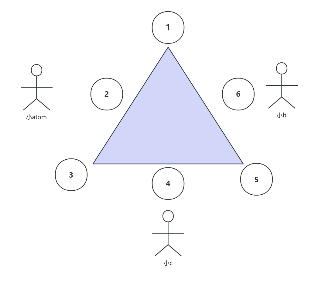 柱子周围有6个位置可以站人,小atom可以看见位于1, 2, 3位置的人;小b可以看见位于3, 4, 5位置的人;小c可以看见位于5, 6, 1位置的人。