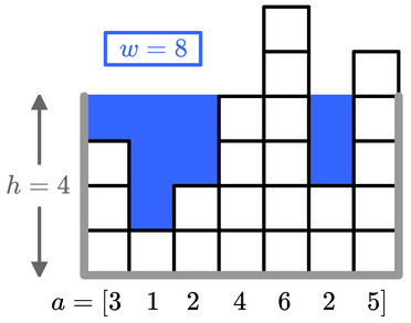 例如, $a=[3,1,2,4,6,2,5]$ ,高度为 $h=4$ ,最终总共需要使用 $w=8$ 个单位的水,如图所示。