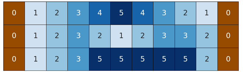 然后是 $n$ 行, 第$i$ 行包含 $m$ 个正整数 $a_{i,j}$ ( $0 \le a_{i,j} \le 10^6$ , $a_{i,1} = a_{i,m} = 0$ )--河道单元的深度。