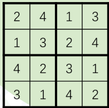 数独是一种著名的益智游戏,这里讨论的是一种简化后的数独-四阶数独。给出一个 4×4 的格子,每个格子只能填写 1 到 4 之间的整数,要求每行每列和四等分更小的正方形部分刚好都由1到4组成,每行每列,每小块不能有重复的数字出现,共有多少种方案? 下图是一个合法的四阶数独的例子。 ![](https://cdn.luogu.com.cn/upload/image_hosting/yhpljvjf.png) 请你编写程序输出字典序最小的那种方案,然后输出一共有多少种合法的填写方法。