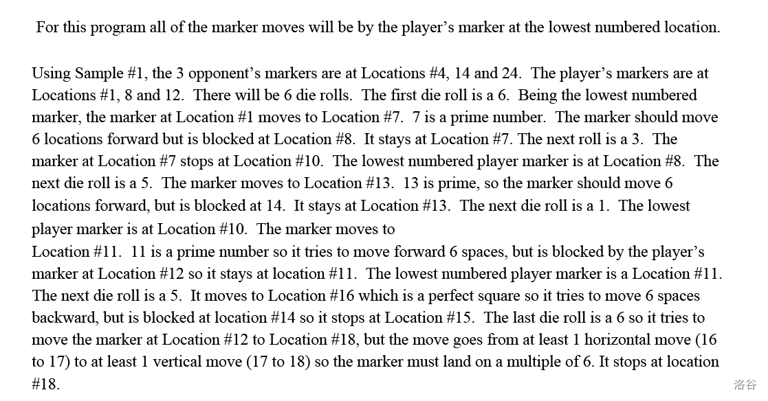 1. 一开始,位于 $1$ 号格子的棋子最靠后(所在格子编号最小),所以它将按照骰子的点数前移 $6$ 格,到 $7$ 号格子。$7$ 是个质数,所以它可以再向前移动 $6$ 格,但是 $8$ 号格子被占用了(有我方棋子),所以它只能停留在 $8-1=7$ 号格子。