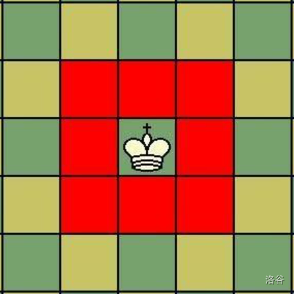 Nickel 给你了一张图片提示,以防你不知道国王的移动规则。下图中王冠即为国王所在位置,红色的格子即为国王走一步可以到达的位置。