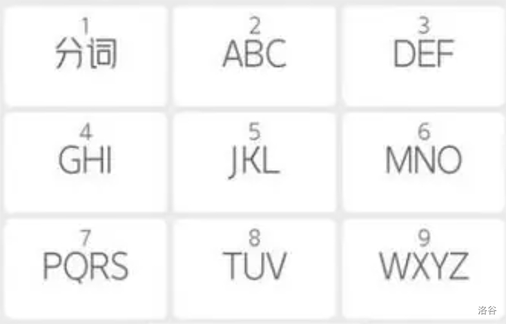 九宫格输入法是手机上的一种输入法,用九个数字键满足文字输入需 求。 布局如图所示。 ![](https://cdn.luogu.com.cn/upload/image_hosting/7r6ymq5i.png)