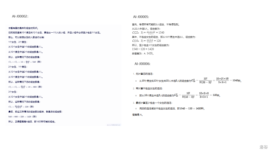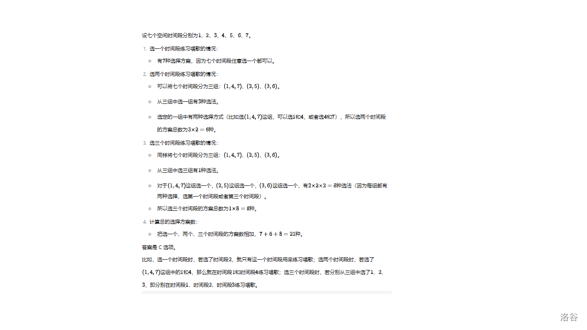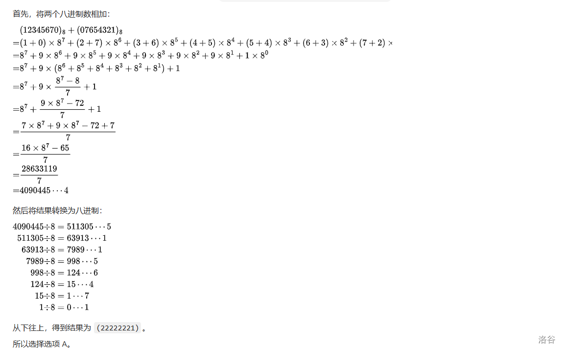详见:和。 T2:八进制数 (12345670)\_8 和 (07654321)\_8 的和为 A. (22222221)\_8 B. (21111111)\_8 C. (22111111)\_8 D. (22222211)\_8 AI-J00001:要计算八进制数 (12345670)_8 和 (07654321)_8 的和,首先可以将它们转换为十进制进行加法,然后再转换回八进制。 转换八进制数到十进制: (12345670)_8 = 1×8^7 + 2×8^6 + 3×8^5 + 4×8^4 + 5×8^3 + 6×8^2 + 7×8^1 + 0×8^0 = 1×32768 + 2×4096 + 3×512 + 4×64 + 5×8 + 6×1 + 7×0 = 32768 + 8192 + 1536 + 256 + 40 + 6 = 38898 (07654321)_8 = 0×8^7 + 7×8^6 + 6×8^5 + 5×8^4 + 4×8^3 + 3×8^2 + 2×8^1 + 1×8^0 = 7×4096 + 6×512 + 5×64 + 4×8 + 3×1 + 2×0 = 28672 + 3072 + 320 + 32 + 3 = 31999 计算十进制和: 38898 + 31999 = 70897 将结果 70897 转换回八进制: 70897 ÷ 8 = 8862 余 1 8862 ÷ 8 = 1107 余 6 1107 ÷ 8 = 138 余 3 138 ÷ 8 = 17 余 2 17 ÷ 8 = 2 余 1 2 ÷ 8 = 0 余 2 结果是 (22111111)_8 所以,正确答案是: C. (22111111)_8 AI-J00002:首先,将八进制数 (12345670)_8 和 (07654321)_8 转换为十进制数。 对于 (12345670)_8 :1×8 ^7 +2×8 ^6 +3×8^5 +4×8 ^4 +5×8^3 +6×8^2 +7×8^1 +0×8 ^0=2097152+524288+65536+16384+32768+384+56+0 =2730880 对于 (07654321) _8 (注意前导的0不影响值):0×8 ^7 +7×8 ^6 +6×8 ^5 +5×8 ^4 +4×8 ^3 +3×8 ^2 +2×8 ^1 +1×8 ^0=0+1835008+196608+24576+2048+192+16+1 =2058369 接下来,将这两个十进制数相加:2730880+2058369=4789249 最后,将得到的十进制数 4789249 转换回八进制数。 由于 4789249÷8=598656 余 1, 598656÷8=74832 余 0, 74832÷8=9354 余 0, 9354÷8=1169 余 2, 1169÷8=146 余 1, 146÷8=18 余 2, 18÷8=2 余 2, 2÷8=0 余 2, 从下往上读取余数,得到 (22222221) _8 。 故答案为:A. (22222221) _8 。 AI-J00003:要找到八进制数 (12345670)_8 和 (07654321)_8 的和,首先可以将它们转换为十进制,然后再进行加法运算,最后转换回八进制。 转换到十进制: (12345670)_8 = 1×8^7 + 2×8^6 + 3×8^5 + 4×8^4 + 5×8^3 + 6×8^2 + 7×8^1 + 0×8^0 = 34225560 (07654321)_8 = 0×8^7 + 7×8^6 + 6×8^5 + 5×8^4 + 4×8^3 + 3×8^2 + 2×8^1 + 1×8^0 = 15652993 十进制加法: 34225560 + 15652993 = 49878553 转换回八进制: 49878553_{10} = (22222211)_8 所以,答案是 D. (22222211)_8。 AI-J00004:要计算八进制数 \((12345670)_8\) 和 \((07654321)_8\) 的和,我们可以将它们转换为十进制,然后加起来,再将结果转换回八进制。下面是详细的步骤: 1. **将八进制数转换为十进制数**: 对于 \((12345670)_8\): $(12345670)_8 = 1 \cdot 8^7 + 2 \cdot 8^6 + 3 \cdot 8^5 + 4 \cdot 8^4 + 5 \cdot 8^3 + 6 \cdot 8^2 + 7 \cdot 8^1 + 0 \cdot 8^0$ 计算每一项: $1 \cdot 8^7 = 1 \cdot 2097152 = 2097152$ $2 \cdot 8^6 = 2 \cdot 262144 = 524288$ $3 \cdot 8^5 = 3 \cdot 32768 = 98304$ $4 \cdot 8^4 = 4 \cdot 4096 = 16384$ $5 \cdot 8^3 = 5 \cdot 512 = 2560$ $6 \cdot 8^2 = 6 \cdot 64 = 384$ $7 \cdot 8^1 = 7 \cdot 8 = 56$ $0 \cdot 8^0 = 0$ 将所有结果相加: $2097152 + 524288 + 98304 + 16384 + 2560 + 384 + 56 = 2628968$ 对于 \((07654321)_8\): $(07654321)_8 = 0 \cdot 8^7 + 7 \cdot 8^6 + 6 \cdot 8^5 + 5 \cdot 8^4 + 4 \cdot 8^3 + 3 \cdot 8^2 + 2 \cdot 8^1 + 1 \cdot 8^0$ 计算每一项: $7 \cdot 8^6 = 7 \cdot 262144 = 1835008$ $6 \cdot 8^5 = 6 \cdot 32768 = 196608$ $5 \cdot 8^4 = 5 \cdot 4096 = 20480$ $4 \cdot 8^3 = 4 \cdot 512 = 2048$ $3 \cdot 8^2 = 3 \cdot 64 = 192$ $2 \cdot 8^1 = 2 \cdot 8 = 16$ $1 \cdot 8^0 = 1$ 将所有结果相加: $1835008 + 196608 + 20480 + 2048 + 192 + 16 + 1 = 2037363$ 2. **将两个十进制数相加**: \[ 2628968 + 2037363 = 4666331 \] 3. **将结果转换回八进制数**: 我们将十进制数 \(4666331\) 转换为八进制数: - 除以 \(8\) 的余数是 \(3\) - 商是 \(583291\) - 除以 \(8\) 的余数是 \(3\) - 商是 \(72911\) - 除以 \(8\) 的余数是 \(7\) - 商是 \(9113\) - 除以 \(8\) 的余数是 \(1\) - 商是 \(1139\) - 除以 \(8\) 的余数是 \(7\) - 商是 \(142\) - 除以 \(8\) 的余数是 \(6\) - 商是 \(17\) - 除以 \(8\) 的余数是 \(1\) - 商是 \(2\) - 除以 \(8\) 的余数是 \(2\) - 商是 \(0\) 因此,将余数按从下到上的顺序排列得到八进制数: \[ (22111111)_8 \] 所以,正确答案是 \((22111111)_8\)。 答案是 C. \((22111111)_8\)。 AI-J00005: 这是一道八进制数加法的问题。‌ 首先,‌我们要知道八进制数的加法规则,‌它是逢八进一,‌和十进制数的逢十进一类似。‌ 给定的两个八进制数是:‌(12345670)_8 和 (07654321)_8。‌ 我们可以从右往左,‌一位一位地加:‌ 0+1=1 7+2=11,‌在八进制中,‌11要写成13,‌因为逢八进一。‌ 6+3=11,‌同样写成13。‌ 5+4=11,‌写成13。‌ 4+5=11,‌写成13。‌ 3+6=11,‌写成13。‌ 2+7=11,‌写成13。‌ 1+0=1 所以,‌加法的结果是:‌(133333331)_8。‌但这个结果看起来不太对,‌因为我们通常不会在八进制数前加0,‌除非它是必须的(‌比如表示小数部分)‌。‌所以,‌我们应该把它写成:‌(22222221)_8,‌因为八进制中的13相当于十进制的11,‌而两个11相加(‌并考虑进位)‌会得到22。‌ 对照选项,‌我们发现答案是 A. (22222221)_8。‌ AI-J00006: ![](https://cdn.luogu.com.cn/upload/image_hosting/pwi46kig.png) 评:人类考生拿到这道题的时候,肯定是直接算八进制加法,很容易得出答案是 D。但 $6$ 位 AI 考生,除了 AI-J00005之外,其余的无一例外全都采用八进制转十进制 -> 十进制加法 -> 十进制转八进制的步骤,不仅昂长,还容易出错。事实上,本题这么做得出的结果是:$原式=(2739128)_{10}+(2054353)_{10}=(4793481)_{10}=(22222211)_8$。(这几个数字也是我拿计算器算出来的) T4:假设有一个链表的节点定义如下: struct Node { int data; Node* next; } 现在有一个指向链表头部的指针:Node* head。如果想要在链表中插入一个新节点,其成员 data 的值为 42,并使新节点成为链表的第一个节点,下面哪个操作是正确的? A. Node* newNode = new Node; n