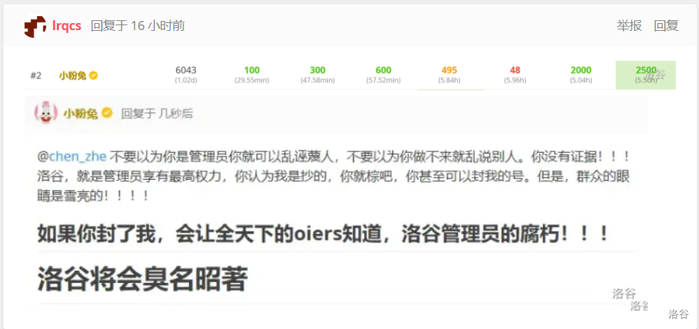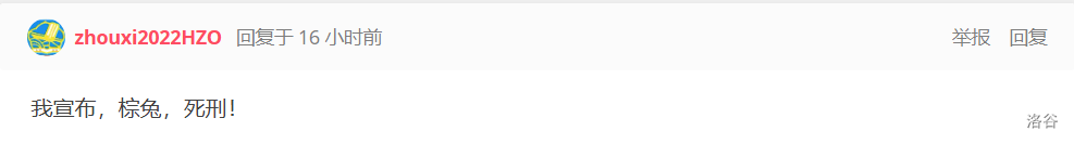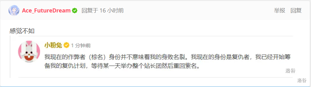 **小粉兔**因[比赛](https://www.luogu.com.cn/contest/199969#scoreboard)作弊,于 `2024-10-05 19:17:00` 被举报并棕名,至此洛谷多了一只**小棕兔**。