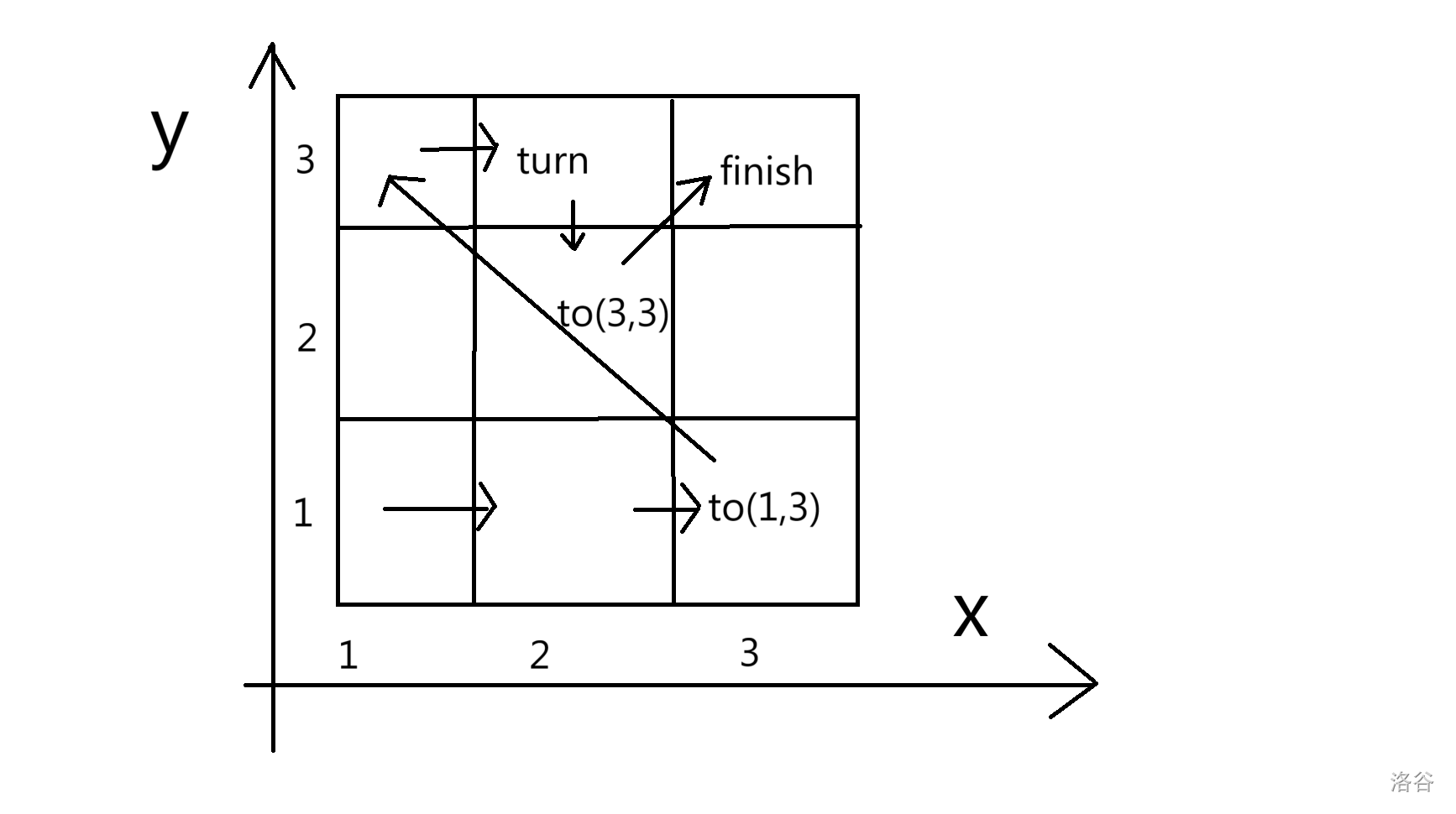 行进方向仅能通过转向法阵改变。初始位置为$ (1,1)$,初始方向为向右。