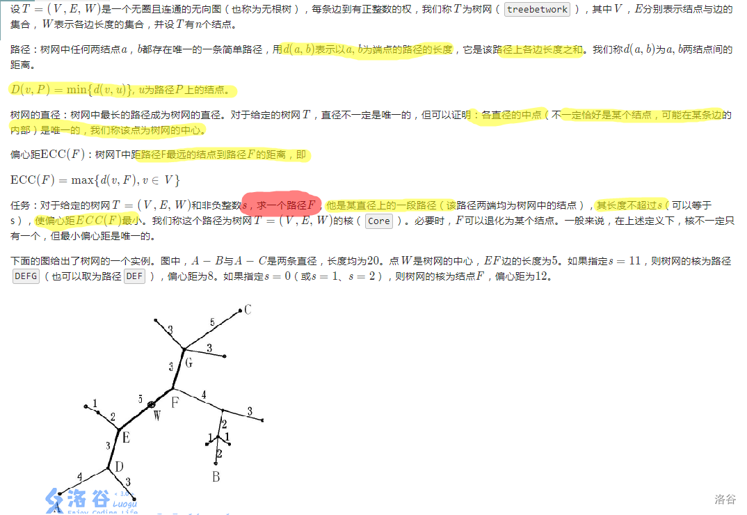 第1行,两个正整数n和s,中间用一个空格隔开。其中n为树网结点的个数,s为树网的核的长度的上界。设结点编号以此为1,2,…,n。