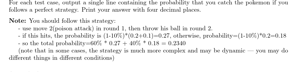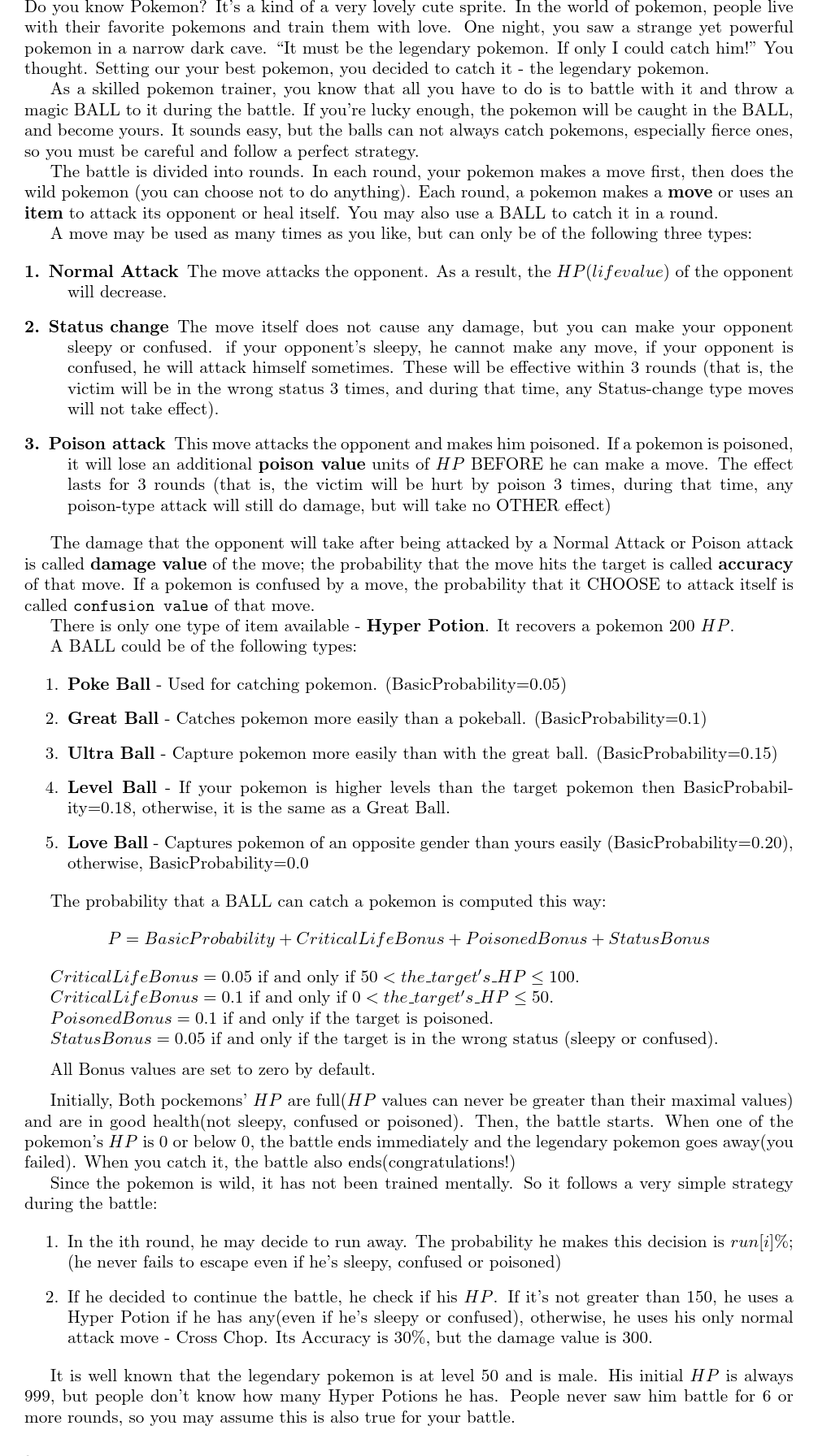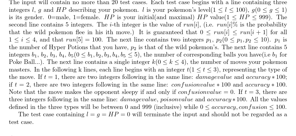 ## 翻译 ### 题目描述 你作为一位 pokemon 训练师,要驯服一只山洞中的野生传奇 pokemon。 你驯服这只 pokemon 的过程分为几轮,每一轮中你的 pokemon(已驯服)先采取行动(当然你可以让你的 pokemon 什么也不做),然后野生 pokemon 再采取行动。每一轮中,pokemon 可以选择采取一个行动或者使用一个道具进行攻击或回血。 一个行动可以进行很多次,但是只有以下 $3$ 种: 1. **普通攻击** 这次行动攻击对手。结果,对手的 $\text{HP}$(生命值)会减少。 2. **改变状态** 这个行动本身不造成任何攻击。但是可以让你的对手昏迷或者被迷惑。 - 如果你的对手昏迷了,它就不能采取任何行动。 - 如果你的对手被迷惑了,它有可能攻击自己。 这些会在 $3$ 轮内有效。(也就是说,受影响者会在 $3$ 轮内处在不正常的状态,并且在那时,任何**改变状态**的行动都不会生效)。 3. **带毒攻击** 这次行动攻击对手并且让它中毒。如果一个 pokemon 中毒了,在它能行动之前,它会失去额外的**中毒伤害**单位的 $\text{HP}$。中毒会持续 $3$ 轮。(也就是说,受攻击者会因中毒而受伤 $3$ 轮,在中毒期间,任何**带毒攻击**都仍能使对手受到伤害,但不会造成其他效果)。 在被**普通攻击**或**带毒攻击**攻击后,对手受到的伤害,被叫做这次行动的**伤害值**。这次行动击中目标的概率叫做这次行动的**精准度**。如果一只 pokemon 被迷惑了,它选择攻击自己的概率被叫做这次行动的**疑惑值**。 在本题中只有一种道具可用**超级药水**。它能恢复一只 pokemon $200$ 的 $\text{HP}$。 精灵球有以下几种类型: 1. **普通精灵球**:用来抓捕 pokemon 。(基础概率 $=5\%$) 2. **超级球**:比普通精灵球更容易抓捕 pokemon。(基础概率 $=10\%$) 3. **高级球** 比超级球更容易抓捕 pokemon。(基础概率 $=15\%$) 4. **等级球** 如果你的 pokemon 比目标 pokemon 等级高,那么基础概率 $=18\%$,否则就与**超级球**一样 5. **甜蜜球** 更容易抓取一只异性 pokemon,此时基础概率 $=20\%$,否则基础概率 $=0\%$。 一只球能抓取一只 pokemon 的概率如下计算: 总概率 $=$ 基础概率 $+$ 暴击加成 $+$ 中毒加成 $+$ 状态加成 - 暴击加成 $=5\%$ 当且仅当 $50