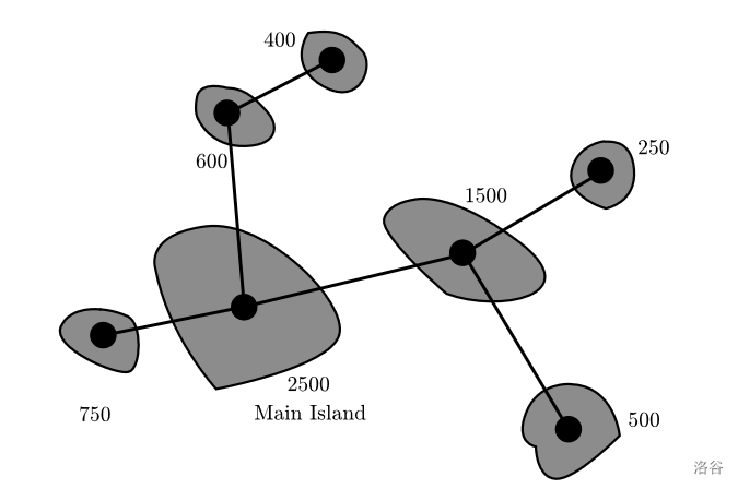 #### 题目背景 PIN 已经找到了几个群岛的商机——为他们提供网络 ![](https://cdn.luogu.com.cn/upload/image_hosting/jrisfqyc.png) 给定每个岛屿的坐标和岛居民数。图中黑点表示他的位置,数字表示岛居民数。PIN 将会在岛间两两修建电缆,直到所有岛屿都可以到达主岛。PIN 决定要用最少的电缆连接网络。这可能存在多个最优解,但 PIN 感兴趣的是客户连接到网络的平均时间。假设所有电缆都同时开始建设,每天每条电缆可以建造一公里。$m_i$ 代表岛上居民数,$t_i$ 是岛屿连接到互联网的时间。那么平均时间可以表示为:$\frac{\sum t_i\times m_i}{\sum m_i}$。