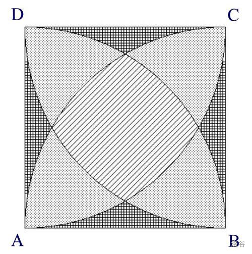 在下图中,有一个正方形 $ABCD$,且 $AB = BC = CD = DA = a$。以四个顶点 $A, B, C, D$ 为圆心、以 $a$ 为半径各作一段圆弧。以 $A$ 为圆心所作的圆弧,从相邻顶点 $B$ 起始,到相邻顶点 $D$ 结束;其余各弧以同样方式绘制。这样会形成三种不同形状的区域。你需要求出这些不同形状区域的总面积(即分别求出每一类形状区域的总面积)。