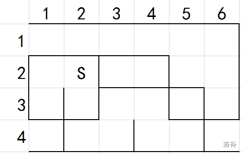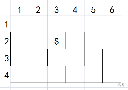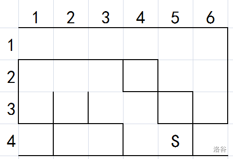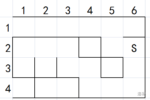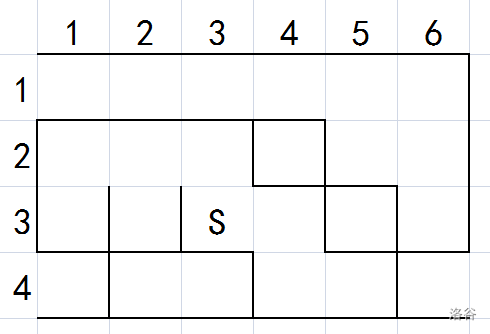 然后题目还会给你一个起点坐标 $(S_x,S_y)$**(注意,题目给的 $S_x$、$S_y$ 是坐标,不是行列,所以图中的 $S$ 点的坐标为 $(2,3)$)**,然后你从这个起点开始走,每步你可以往上下左右四个方向移动一格,但有限制条件。