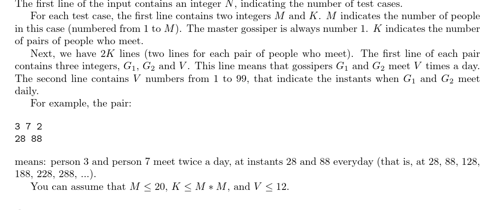 UVA10850 The Gossipy Gossipers Gossip Gossips