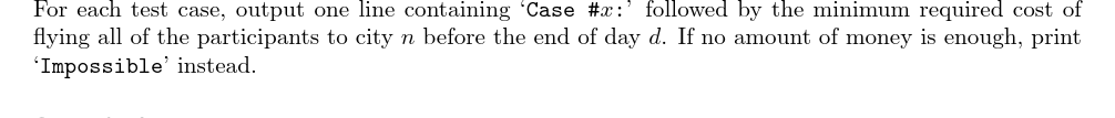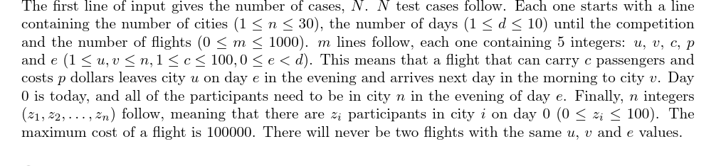 【问题描述】 有 N 个城市,每个城市都有一些选手要到第 N 个城市去参加比赛。比赛的组织者可以租用城市之间的一些飞机,他们的出发时间可能不同,但是都是从某天晚上出发,然后第二天早上到达目的地,每架飞机上都有载客上限和租金。现在有一个优惠:只要租用一架飞机,就可以免费使用所有价格小于等于该租金的飞机。组织者希望在 d 天内花最少的钱把所有的选手送到比赛地。 比如说,有 4 架飞机,租金分别是 10000,25000,30000,40000,你租下 30000 元的那架,那么就可以免费使用 10000 和 25000 的那架。相当于租下 3 架飞机的费用就是 30000。