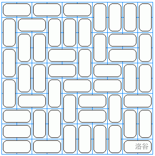 给定一个 $m×n$ 的矩形网格,计算用多米诺骨牌完全平铺该网格的方法数。需要注意的是,即使两种平铺方式通过旋转后相同,它们仍被视为不同的平铺方案。多米诺骨牌是由两个边对边相连的单位正方形组成的形状,等价于在网格图中每个方格中心放置顶点,并在相邻方格对应的顶点之间连接所形成的完美匹配。(注释:即多米诺骨牌为 $1×2$ 大小。)下图展示了一个平铺示例。
