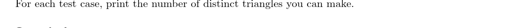 给定$n$条边,长度分别为$1,2,3,...,n$。用其中三条边构成一个三角形,有多少种不同的方案?注意,一条边只能使用一次。