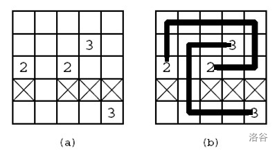 在一个 $N \times M$ 的网格里有空格和障碍,其中两个空格子里标记着 $2$,还有两个空格子标记着 $3$。