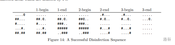 下面的一系列图表展示了一个成功实现目标的示例场景。最初,你用@表示的车辆在(1,5)的5 × 5网格区域内被发现,你会看到一些由#表示的感染区域。