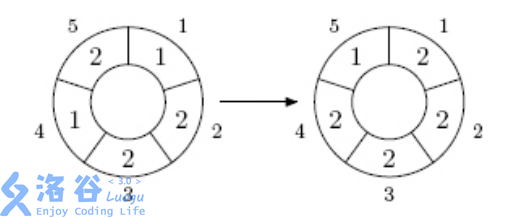 下图显示了一个五元素细胞自动机(样例)的一次操作: