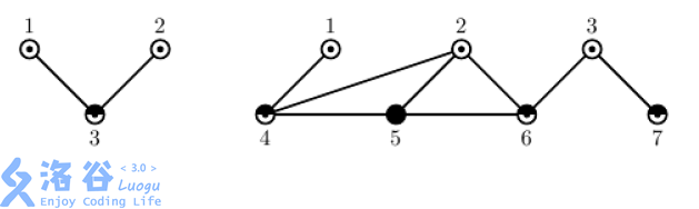 下面给出了 2 个图. 第一个图有 3 个结点, 第二个图有 7 个结点. 在两个图中, 任意一个结点的度数都不超过 3 并且都使用 3 种颜色着色.