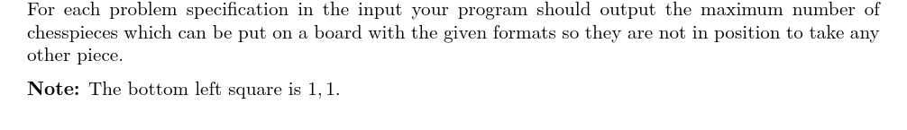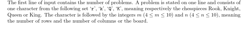 题意描述:给定一个m乘n的国际象棋棋盘,给定4种棋子,车,马,王,后,从中选出一种棋子,问最多能在棋盘上放多少个,使得彼此不互相攻击。 后(Q):横、直、斜都可以走,步数不受限制。 车(r):横、竖均可以走,步数不受限制,不能斜走。 马(k):走“日”字。 王(K):周围八个格子。