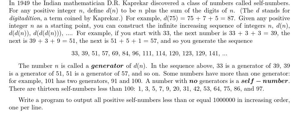 在1949年印度数学家D. R. Daprekar发现了一类称作Self-Numbers的数。对于每一个正整数n,我们定义d(n)为n加上它每一位数字的和。例如,d(75)=75+7+5=87。给定任意正整数n作为一个起点,都能构造出一个无限递增的序列:n, d(n), d(d(n)), d(d(d(n))), . . . 例如,如果你从33开始,下一个数是33+3+3=39,再下一个为39+3+9=51,再再下一个为51+5+1=57,因此你所产生的序列就像这样:33, 39, 51, 57, 69, 84, 96, 111, 114, 120, 123, 129, 141, . . . 数字n被称作d(n)的发生器。在上面的这个序列中,33是39的发生器,39是51的发生器,51是57的发生器等等。有一些数有超过一个发生器,如101的发生器可以使91和100。一个没有发生器的数被称作Self-Number。如前13个Self-Number为1, 3, 5, 7, 9, 20, 31, 42, 53, 64, 75, 86, 97。