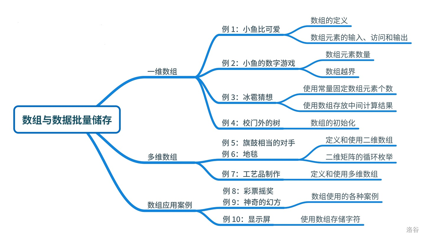 既然可以通过循环语句来重复执行结构类似的语句,也有办法一次定义一组成千上万个的相同类型的变量——使用数组。这样就可以把大量的数据存储下来,随时使用了。数组不仅可以存储输入的数据,还能存下运算过程中的“半成品”甚至答案,是 C++ 中非常重要的一部分。