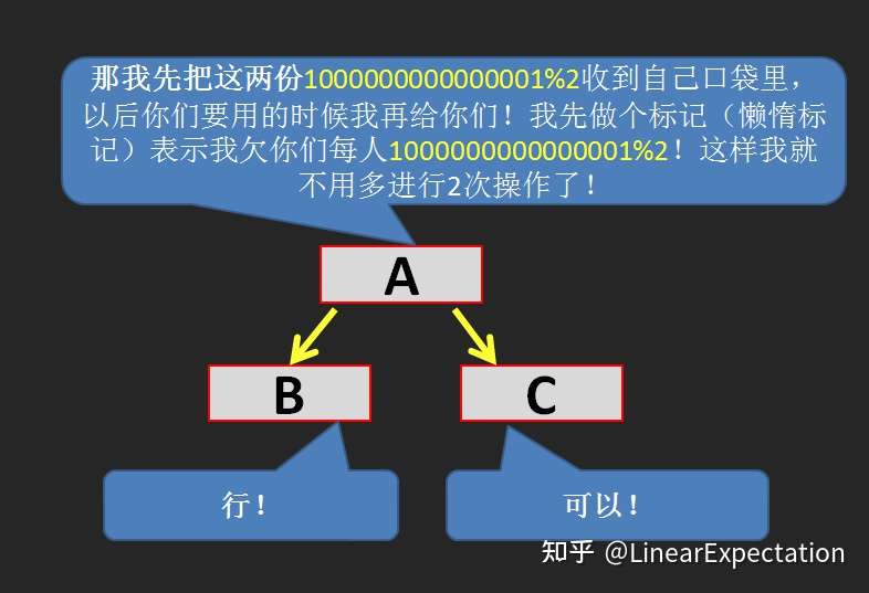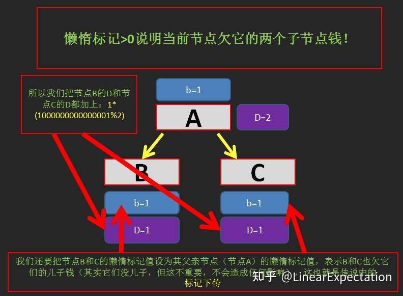 同理,一个有 $n$ 个元素的区间,若修改值为 $k$,则他的 $d$ 为 $n\times k$。懒惰标记所标记的内容仅仅是修改量,即欠每个儿子多少钱,只要懒惰标记大于 $0$ 就一定是欠了钱。