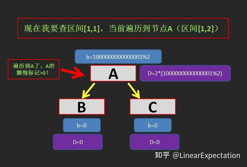 这张图中,$d$ 还是线段树本身的值,而 $b$ 是懒惰标记数组的值,显然,当我们需要查询下面的两个儿子的时候,就要及时地将欠下的钱还回去,也就是根据懒惰标记来将所查询部分的值更新。