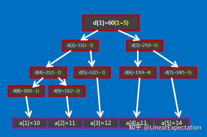 接着我们看看他的父节点,也就是 $d_4$,他的值是 $d_8+d_9=21$,也就是 $a_1+a_2$,仔细观察他的区间,因为包括了 $a_1$ 和 $a_2$ 所以他的区间就是 $1\sim 2$,同理不断合并之后最后根节点的值就是他们的和,而其区间就是 $1\sim 5$。