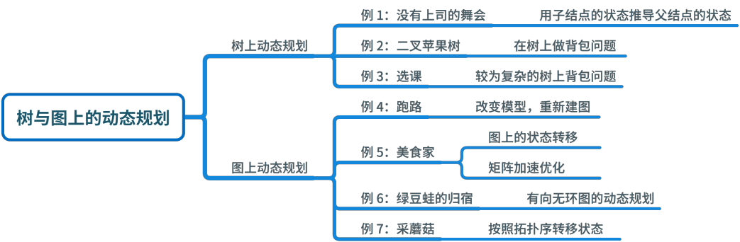 树与图上的动态规划,顾名思义,就是以树或图为模型的动态规划。树上动态规划是最常见的动态规划形式之一,因为树型本身就带来了子结构(树上的父子关系),大部分情况下,都是通过子结点的 DP 值推导出父结点的 DP 值。而图上的动态规划,由于没有很明显的子结构,所以比较受限。有向无环图(DAG)由于点之间有着明显的分层,性质相较于图更加良好。许多图上的问题可能转化后成为树上的或 DAG 上的问题。剩下的许多问题模型,又可以转化为最短路问题。我们将依次介绍上述提到的模型。