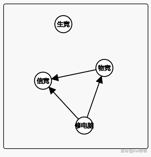 那你会发现,当你想学那个常数大的东西时要先学树状数组,想学树状数组又要学线段树……这不是陷入死循环了么?其实,当这个图**存在环**时是不能进行拓扑排序的(原因如上),所以,能跑拓扑排序的一定是一个无环图,而且还得是一个有向图,那么,综合起来就是: