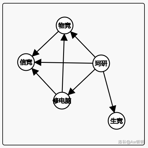 这样的一个可行的顺序,我们称之为“拓扑序”,由于在同时有多个前置课程时,选任何一个都可以(不影响结果),所以拓扑序可能有多种多样的结果,这不影响我们选课(对吧)。