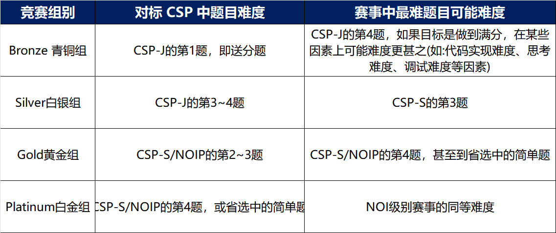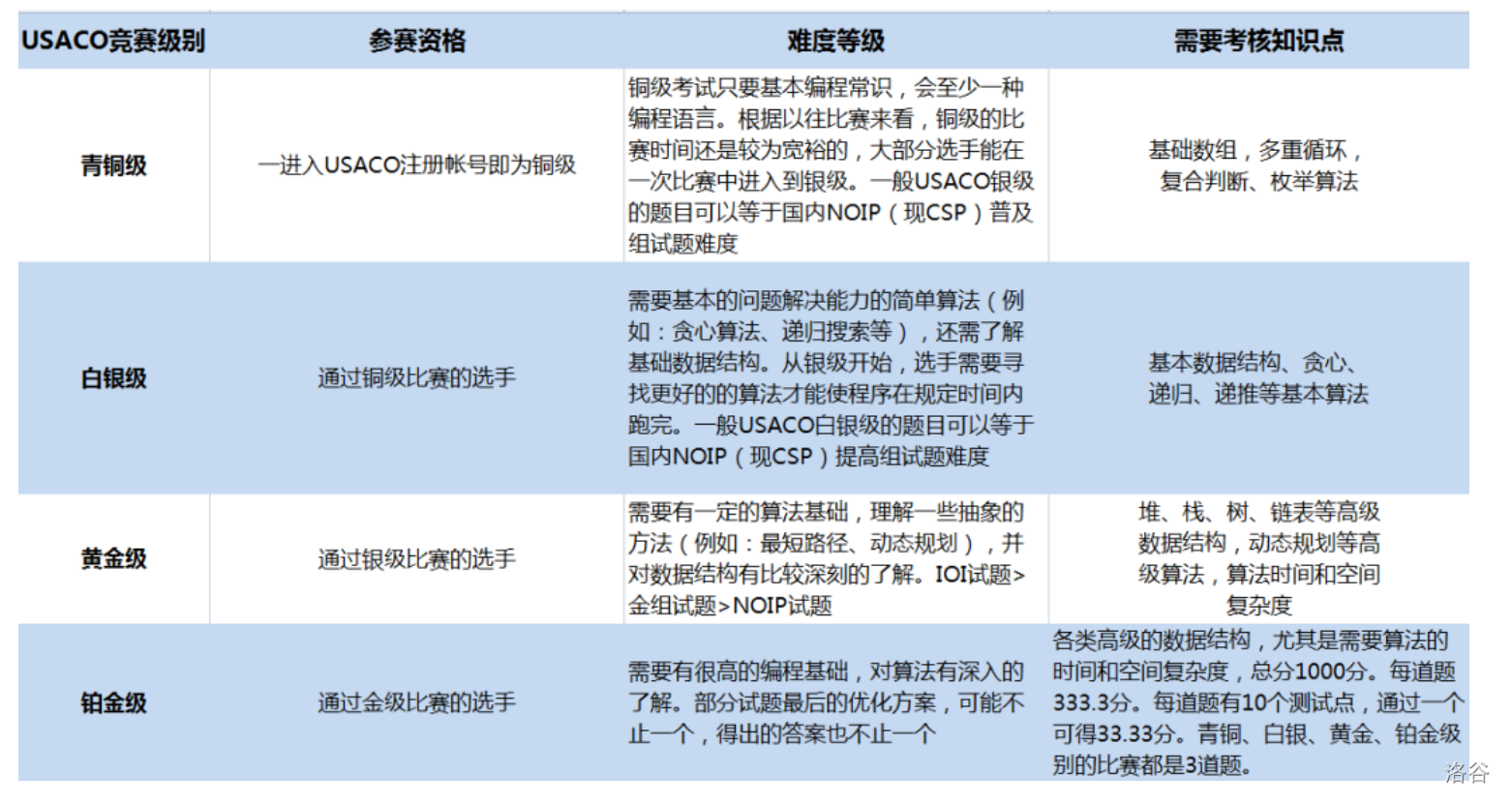 USACO 竞赛四个等级难度是层层递增的,所以对学生能力要求越来越高。