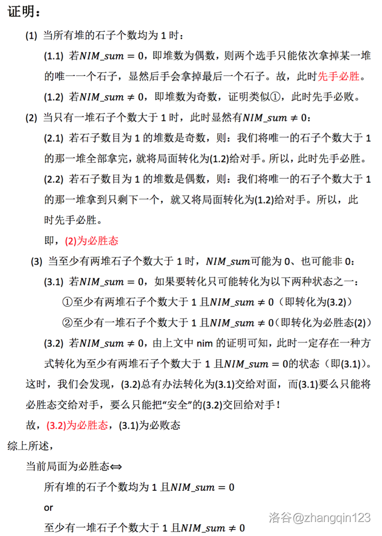 3.证明: 我们也是不严格证明,我们将每堆物品数异或起来为0这个状态称为必败态,顾名思义,这个状态下,谁取谁必败。因为当这个状态时,经过两人轮流取物,后者始终可以维持这个必败态,即A取完后,B一定可以取一个数,使得取完后每堆物品数异或起来仍为0。这样一直到最后一轮,B取完一定会使每堆数都为0,此时同样也是必败态(异或起来为0),这时B获胜,A面对所有堆都为0这个状态取,直接失败。